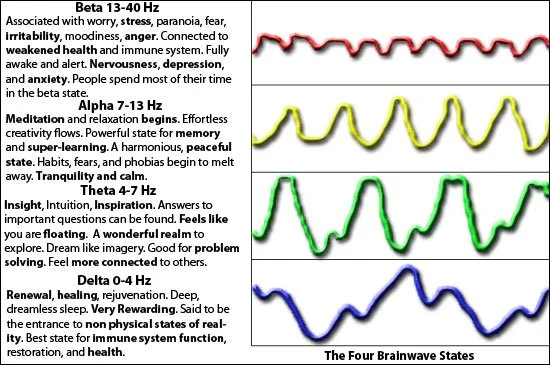 2. Floatees increase their Theta brainwaves, (4-7 hz); (see chart below) slow cycling but high-frequency brainwaves which coincide with the hypnagogic state we experience just before falling asleep and just before fully waking. Theta brainwaves are also closely linked to creativity, super-learning, meditation, as well as visionary experiences and quantum leaps of understanding.
